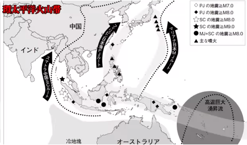 ところで当該動画の25:03あたりから更に興味深い話題になったのでありまして、火山の噴火と地震を関連付ける媒体として地球深部の巨大熱流(スーパープルーム=熱移送説)を紹介しているのであります。