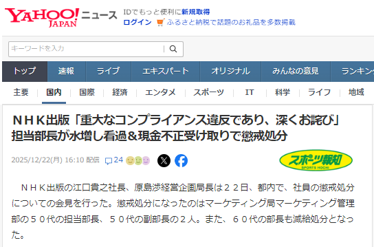 公金が入っている割にはやらかし件数が多いような気がしますが、もう少し日本人視聴者に気遣いいただきたいものでありますね。やらかし1件につき1年間受信料徴収口座凍結(勿論、前年分遡及無し)で如何でしょうか。?それが嫌ならスクランブル、もしくは天気予報と災害情報に特化したチャンネルとスポーツやドラマ等エンタメ及びニュースのチャンネルで運営するということでよろしいかと思うのであります。